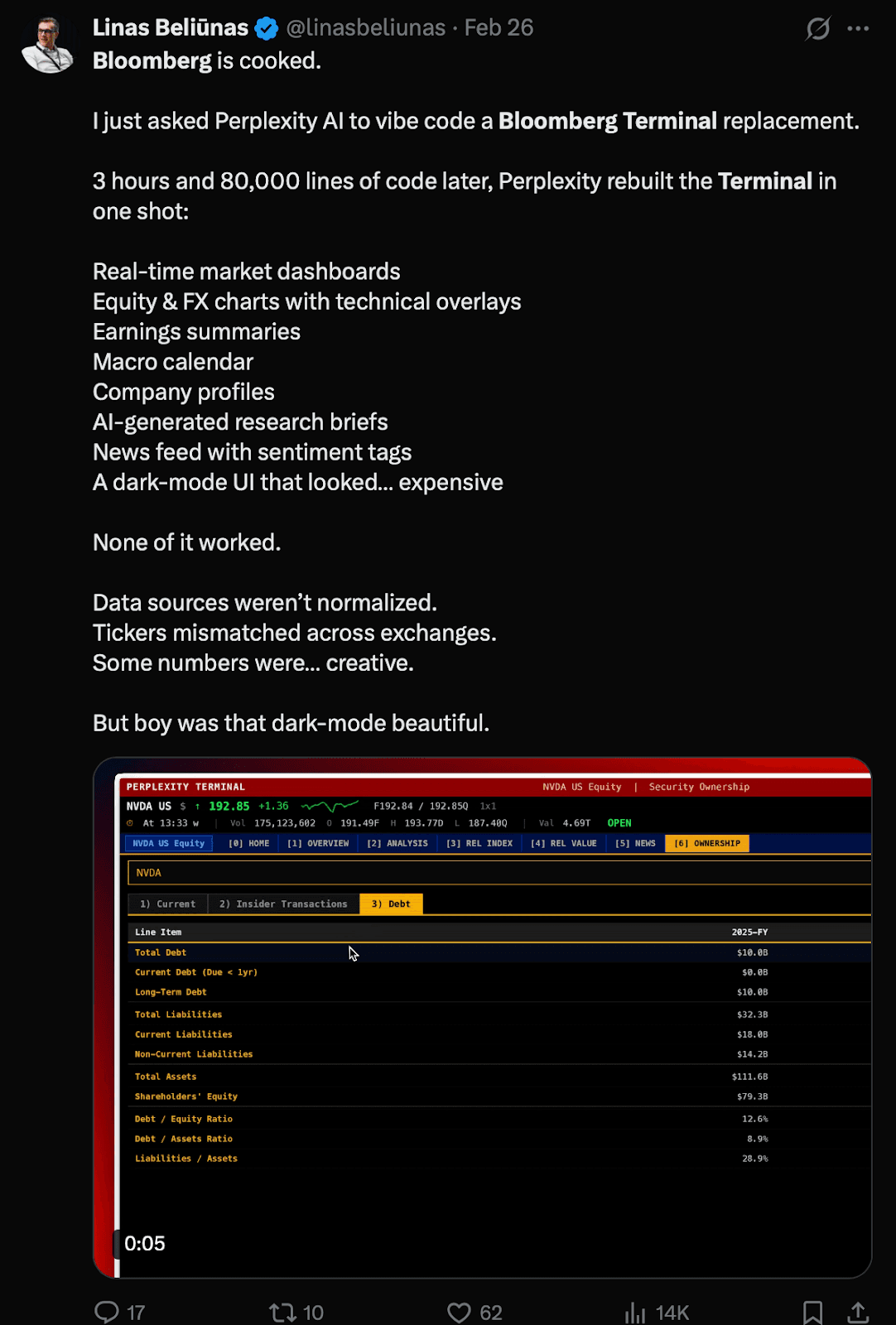 There's been a rather hilarious post doing the rounds recently, someone built a UI that looks and behaves almost identically to the Bloomberg Terminal using Claude Code, and the internet promptly declared that Bloomberg was "cooked." Which is a wonderfully dramatic response, and also almost entirely misses the point, especially that Linus even mentions this in his post… but it is a splendid example of how UI & data are two very different things to consider.